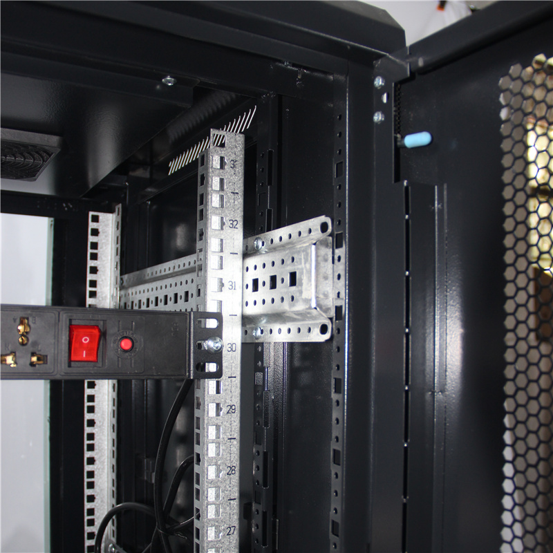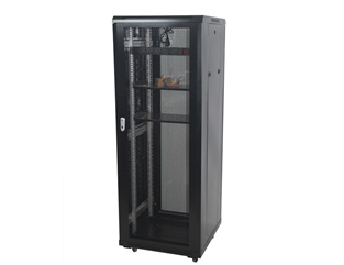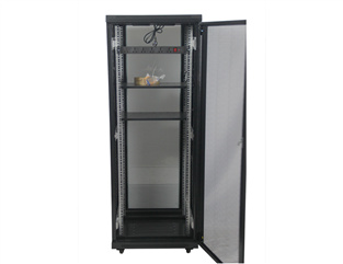 ◆服务器柜配高密度六棱网孔门,标准柜配4.5mm白色钢化玻璃门,均使用高级月光旋把机柜门锁