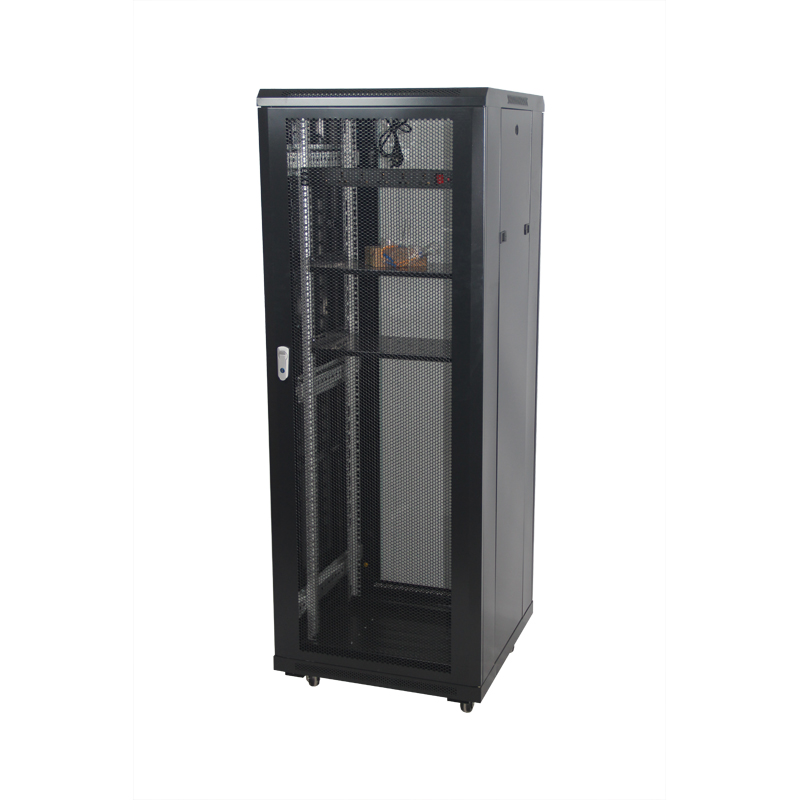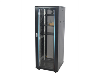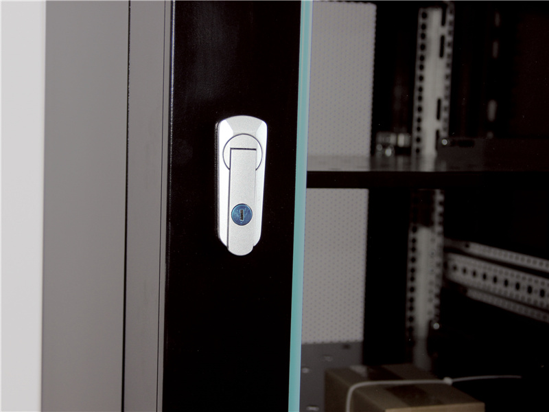◆服务器柜配高密度六棱网孔门,标准柜配4.5mm白色钢化玻璃门,均使用高级月光旋把机柜门锁